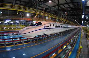 一列CRH2型動車組在武漢動車基地進行檢修。(圖片來源:香港大公報)