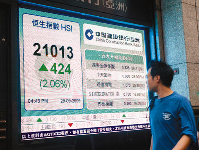 即月期指收21013點,10月期指收報20915點,低水98點。匯控為升市火車頭,該股曾升穿90元,收市大升2.6%至89.4元。中資金融股和出口股獲追捧,工行升3.3%至5.94元,利豐在憧憬出口復蘇下,午后破31元52周高位,收市報31.25元,升6.3%,成交3.17億元,升幅為藍籌之冠。