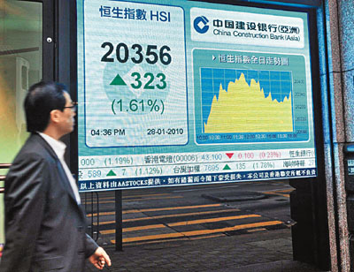 中新網1月29日電 據香港《文匯報》報道,聯儲局議息結果顯示前景樂觀,外圍股市回穩,連跌6天的港股在期指結算日也借機反彈,恒指最多彈逾400點,全日收報20356點,升323點,升幅1.6%,扭轉6天的跌勢,但成交額卻減至664.7億元,反映買盤不活躍。