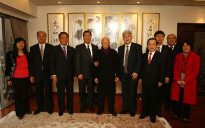 24日香港寒風凜凜,但國學大師饒宗頤位于跑馬地的居所愛賓室里,卻洋溢著暖暖春意。陳進玉一行帶著溫家寶總理和國務委員馬凱的新春祝福,以及親筆簽名的新春賀卡,在傳統(tǒng)新春佳節(jié)到來前夕,專程來港探望饒宗頤。小小會客室賓朋滿座,歡聲笑語不絕于耳,與墻上的饒老得意之作愛賓室題字相映成趣。