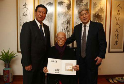 陳進玉代為轉交這份千里之外的濃濃祝福,饒老接在手中,凝神細望,若有所思,笑得開懷:“虎年,好年”。陳進玉轉達了溫總理的新春問候。他說,饒宗頤先生為弘揚中華民族優(yōu)秀傳統(tǒng)文化、促進國家文化建設提出了許多寶貴意見。去年初饒老獲溫總聘任,擔任中央文史研究館館員,當得知饒老盡管年事已高,仍關注國家文化建設時,溫總深受感動,也十分關心饒老的健康和生活,百忙之中,仍將饒老安康緊系心頭。