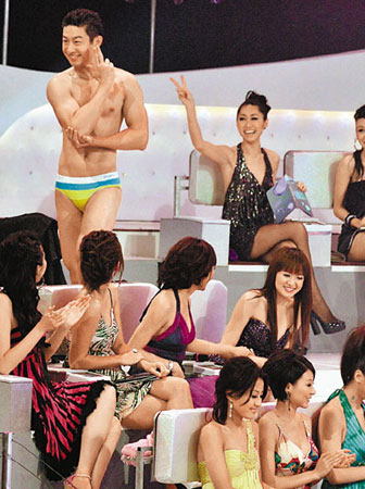 到最討女評判歡心的泳裝環節,先由一眾前輩港男以沙灘裝出場,突然齊齊脫去上衫秀肌肉,女觀眾已經大叫,到12位港男輪流濕身展示肌肉及性感小泳褲,尤其1號重要部位激突,現場女士無一不熱血沸騰。其中5號、6號與女舞蹈員共舞之時,跣手不慎按到女方胸部位置。