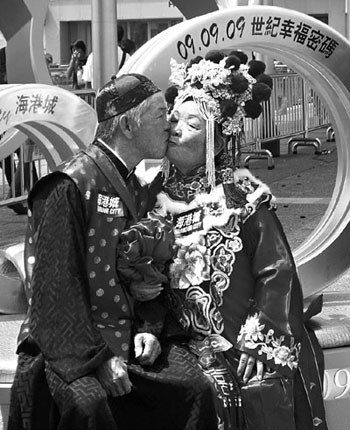9月8日,六對夫婦與情侶身穿中西結婚禮服,一起親吻作愛的見證。為與天下有情人在09年9月9日(09.09.09)這世紀一遇的“長長久久”日子共度最浪漫時刻,香港海港城特別在當日舉行宣傳活動。 中新社發 譚達明 攝