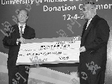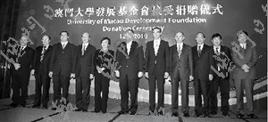 澳門社會知名人士何鴻燊、曹其真,以及呂志和基金有限公司、澳門霍英東基金會分別向澳大發(fā)展基金會捐款3000萬澳門元,款項將作為基金會的永久性基金,由基金會管理,并僅作支持澳大發(fā)展之用。除前立法會主席曹其真親自捐贈外,澳門博彩股份有限公司董事蘇樹輝代表何鴻燊,呂志和之子呂耀東代表呂志和基金有限公司,澳門霍英東基金會主席霍震寰代表該基金會向澳大捐贈有關(guān)款項。