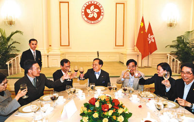 曾蔭權5日在禮賓府筵開5席,來自各黨各派的約40名議員依時赴會,財政司司長曾俊華、律政司司長黃仁龍及大部分局長和副局長也同為座上客。據引述,曾蔭權在午宴上致辭時向議員們笑說,議事之外都有人情,火花之外都有風花雪月,5日的宴請是希望大家除了公事之外,也有多些溝通和交流。