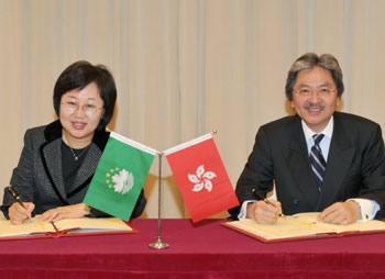 24日,香港財政司司長曾俊華及澳門政法務司司長陳麗敏在香港簽署了《中華人民共和國香港特別行政區政府與中華人民共和國澳門特別行政區政府關于持永久性居民身份證入出境及互免填報入出境申報表協議》。這標志港澳兩地在出入境事務方面的合作進入新的階段。
