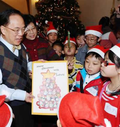 曾蔭權(quán)伉儷24日在禮賓府舉行了一個圣誕派對,邀請40多位來自深水埗的小學(xué)生,擔(dān)任他的特別嘉賓,一同歡度一個溫馨愉快的早上。曾蔭權(quán)在博客中透露,自己與小朋友在圣誕樹前大合照,他們又送其一張巨型的圣誕卡,里面全是他們可愛的簽名和祝福,其中一句“祝你長命一點”更是“搶眼”:“小孩的直率和可愛,令我不禁失笑。”