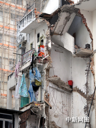 在微風中,懸在剝露于外的墻壁上的美女海報、來不及收的晾曬衣物和家當,沿著樓梯痕跡排列的七倒八歪的信箱、放在已成為“懸崖”的墻角處的紅色膠桶、鐵架床床頭的毛絨玩具……訴說著一個個已不復存在的故事。震撼猶存,更令人唏噓。