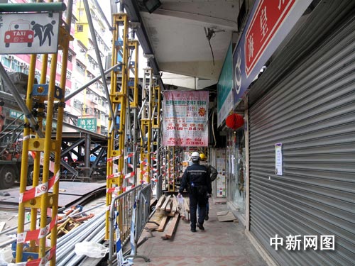 香港馬頭圍道塌樓周圍的善后工程仍在進行。相鄰舊唐樓被當局以鋼架支撐加固。出入的警員及工程人員亦頭戴安全帽。