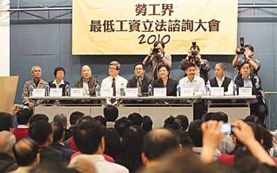 中新網4月27日電 據香港《文匯報》報道,港府正就香港首個最低工資水平收集各界意見。來自工聯會、勞聯及職工盟的勞工界昨日號召逾500人參與“武林大會”,討論最低工資最新形勢,與會人士的主流意見傾向將最低工資水平訂為時薪33至35元(港幣 下同),但亦有工會只要求訂為27元,故仍需待問卷調查完成統計后,才能定出一個代表勞工界的最低工資水平,估計約一星期后有結果。