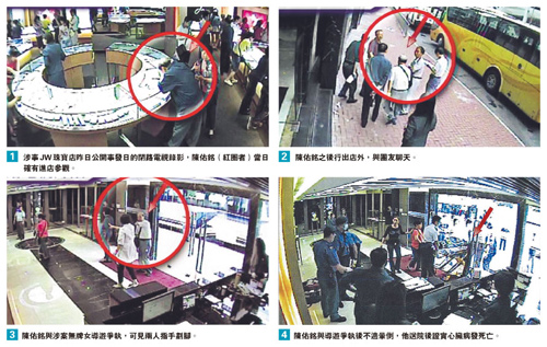 中新網6月4日電 據香港文匯報報道,65歲前乒乓國手陳佑銘上月訪港旅游,疑不堪被迫購物與導游爭執、引發心臟病發死亡事件,港府強調已與警方展開調查,定必追究到底。媒體獲得事發時珠寶店閉路電視片段照片,相中所見陳佑銘在珠寶店曾三出三入,一度走出店外看報紙,最后一次回店內時與導游及職員發生爭執。