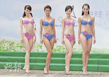 中新網(wǎng)10月15日電 據(jù)香港《文匯報(bào)》報(bào)道,2009年亞洲小姐選舉候選佳麗14日在香港荃灣一間酒店以泳裝在池畔與傳媒見面,但2號(hào)王希瑤患上氣管炎缺席,只有18位佳麗亮相。大會(huì)安排佳麗穿上比基尼泳裝,各佳麗身裁都顯得突出。