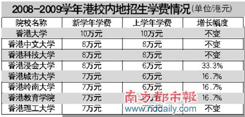 香港浸會大學內地本科生學費從去年的6萬港元增至8萬港元,增加超過三成。而香港教育學院、香港嶺南大學的學費標準也由每年6萬港元升到7萬港元。目前已經公布今年內地招生計劃的高校中,也有高校的收費標準維持不變,如香港大學、香港中文大學、香港科技大學、香港理工大學。但是,香港大學將內地生預繳費用從1.5萬港元增至3萬港元。