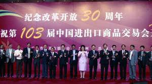 由廣州市工商聯、市總商會、市外商投資企業商會、市民營企業商會共同主辦的“紀念改革開放30周年暨慶祝第103屆中國進出口商品交易會開幕宴會”,14日在廣州白云國際會議中心舉行。廣州市長張廣寧,市委副書記蘇志佳,市委常委、統戰部長孔少瓊等,以及粵港澳商界代表逾1000人出席。