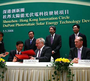 中新網(wǎng)5月6日電 據(jù)香港文匯報(bào)報(bào)道,“深港創(chuàng)新圈”引入首個(gè)港深聯(lián)手的高新科技研發(fā)生產(chǎn)項(xiàng)目。位居全球500強(qiáng)的美國杜邦公司5日與香港科技園公司和深圳市政府代表簽署合作意向書,在港深分別設(shè)立太陽能研究及產(chǎn)業(yè)平臺(tái)。