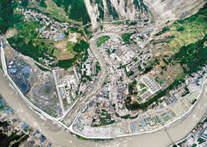 傍晚5時30分,飛機飛抵汶川縣映秀鎮上空,記者在機組人員的幫助下,打開機艙門,向外張望,發現整個鎮子已經變為一片廢墟,只有少數的工廠外墻還在堅強地佇立著。“這里是地震的中心地帶,相反汶川縣城卻沒有那么嚴重的,只是道路不通影響救援而已。”