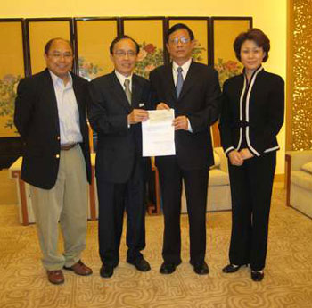 圖:晶苑集團主席羅樂風(左二)向中聯辦賑災專戶捐款港幣105萬元,中聯辦副主任鄭坤生(右二)代為接受。(圖片來源:大公報)