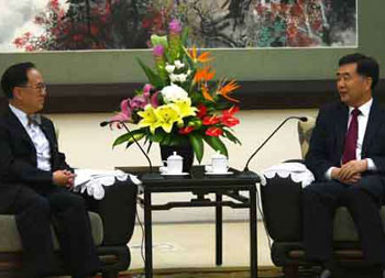 圖:特首曾蔭權(quán)(左)與中共中央政治局委員、廣東省委書記汪洋會(huì)面。(圖片來源:大公報(bào))