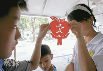 Dawn26日與4名同受艾滋病影響的內(nèi)地年輕人來香港訪問,先到香港單親協(xié)會探望10多名單親兒童,一齊透過剪紙表達(dá)愿望。Dawn用紅紙剪出蘋果,上面有個“文”字,她說,最希望母親可以讀書,“吃下充滿知識的蘋果,那就有希望了”。