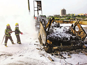私家車與旅巴相撞后起火,兩車燒剩車架,消防員正向大巴噴化學泡沫撲救。(圖片來源:文匯報)