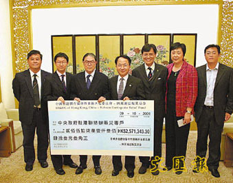日前港協暨奧委會會長霍震霆、副會長余國梁、義務秘書長彭沖及義務副秘書長王敏超,攜同捐款支票到中聯辦,由中聯辦副秘書長王志民、宣傳文體部副部長陳亞瓊及李冰接受,將全數捐款轉交“中央政府駐港聯絡辦賑災專戶”,幫助四川災區人民。