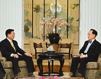 香港特首曾蔭權(quán)今年7月在禮賓府會見臺灣“海峽交流基金會”董事長江丙坤。(圖片來源:文匯報)