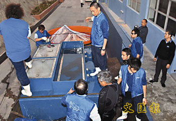 兩條患病的中華鱘,本月10日上午由5名專家陪同下,送往廈門保育基地。目前它們正在康復中。(圖片來源:文匯報)