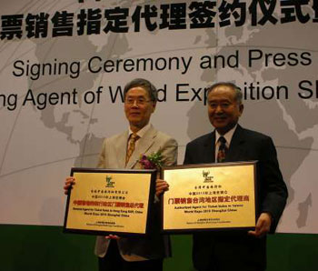 中新網(wǎng)3月3日電 據(jù)香港《大公報(bào)》報(bào)道,“中國(guó)2010年上海世博會(huì)門(mén)票銷(xiāo)售制定代理簽約儀式暨媒體見(jiàn)面會(huì)”2日下午在上海世博局舉行,此次簽約的13家銷(xiāo)售代理商,境內(nèi)代理商4家,境外代理商9家。香港中國(guó)旅行社成為首批簽約的上海世博會(huì)門(mén)票境外指定代理商之一,香港中旅總經(jīng)理周來(lái)衛(wèi)接受了上海世博局授牌。