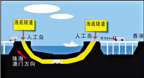 據大橋工程可行性研究總報告顯示,大橋主體工程長約35公里,擬定采用橋隧結合方案,其中位于伶仃西航道和銅鼓航道之間的海底隧道長6.75公里,隧道與橋梁相接處各修兩個橫截面長1公里的人工島;隧道造價約211億元人民幣,占到大橋主體工程預算投資額的近一半,其最深處離海平面40米左右,將確保30萬噸級油輪和15萬噸級以上集裝箱順利通航。
