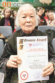中新網11月19日電 九旬長者仍然老有所為。據香港媒體報道,九十六歲的張麗華雖然居于香港安老院,親人長居英國,但她精神甚佳,七年前自發為院舍出一分力,專責探訪院友登記一職,至今仍快樂地盡其所職,昨日(十八日)獲頒發義工獎勵計劃銅章,以表揚及肯定張婆婆對小區的付出。