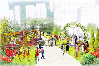 “姻園”的設計和布置都圍繞婚嫁這一主調,并提供約30,000平方呎凈樓面的零售用地。除了喜帖店鋪,該處還提供與婚嫁有關的商品和服務,包括婚紗、禮服、鮮花、禮餅、發(fā)型屋、珠寶首飾、影樓、房車租賃、婚宴舞會統(tǒng)籌服務,以及場地布置等。毗連“姻園”的部分空地也有切合婚嫁主題的裝飾布置和藝術雕塑品擺設。