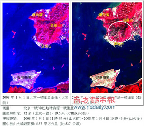 今年1月1日至3日香港屯門發(fā)生三級(jí)山火,在動(dòng)用我國(guó)發(fā)射的兩顆衛(wèi)星進(jìn)行精確遙感測(cè)量后,得出了精確的山林被毀面積為537公頃(約5.37平方公里),比香港消防處早期公布的350公頃過(guò)火面積有大幅增加。