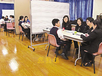 面試官之一的駱太與其它家長面見了10多位學生后稱,大部分學生均有備而來,有學生過于緊張,說話聲音微弱或不甚流暢,要加以改善。另一位面試官劉太笑言,是次活動讓她看見不同學生的面試表現,“有些自信、有些膽小”,從中更學到不少面試技巧,有助明年兒子升中時可派上用場。 (記者 歐陽杏櫻)