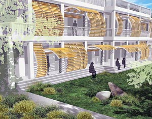 中大碩士生林穎茵及袁軒瑜與嘉道理農場暨植物園合作,改建海南島鸚哥嶺森林保護區的廢置軍營為游客咨詢中心,設計將竹制成百葉,阻隔陽光直射入中心,既可遮陰又保持空氣流通,獲香港建筑師學會頒碩士生組優異獎 明報圖