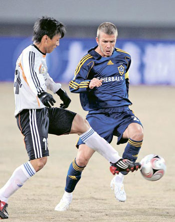 這次洛杉磯銀河“亞洲之旅”共分韓國首爾、中國上海及香港3站,貝克漢姆5日于上海八萬人體育場(chǎng)帶領(lǐng)銀河以3﹕0擊敗東亞晨曦聯(lián)隊(duì)。貝克漢姆正選上陣,披甲70分鐘,并貢獻(xiàn)了1次助攻。