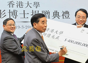 有關支票捐贈儀式19日于港大舉行,除鄭裕彤外,港大校務委員會主席馮國經、校長徐立之、法律學院院長陳文敏等均有出席。馮國經贊揚鄭裕彤一直對教育事業大力支持,這次捐贈也是對港大每一成員的鼓勵,他對此深表感激。徐立之則指,鄭裕彤的捐款除支持港大“百周年校園”計劃外,也有點名支持法律學院,對學院發展幫助甚大。