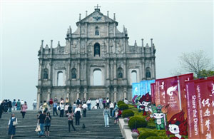 主要旅游景點布置宣傳裝飾 澳門盛裝迎奧運圣火
