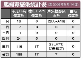 新證實的4宗EV71陽性個案包括:1例為同善堂第二托兒所幼兒;1例為濠江小學二年級學童,其弟為已停托的同善堂第二托兒所的幼兒,較早前亦有皰疹性咽峽炎癥狀;1例為仁伯爵綜合醫院因其它疾病住院的幼兒,在常規檢查中發現,并無腸病毒感染的癥狀,14日已出院;1例為未入學或入托的門診病人。