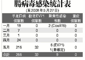 中新網5月28日電 據澳門日報報道,澳門衛生局27日再接獲3例腸病毒病例報告,截至27日中午,澳門今年累計錄得266個腸病毒(手足口病皰疹性咽峽炎)病例,無接獲腸病毒感染聚集性感染個案。