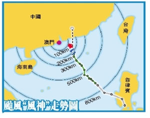 按目前移動路徑,預期“風神”25日清晨時分最接近澳門,在距離澳門東面約100多公里掠過,并于清晨至早上時分在珠江口以東附近登陸。氣象局將密切注視其移動路向及強度變化,不排除改掛更高風球。