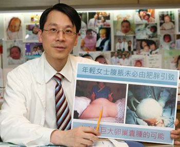 像王小姐的個案并不罕見。香港婦產(chǎn)專科醫(yī)生盧兆輝說,以他3、4年前在東區(qū)醫(yī)院的經(jīng)驗,每周也有4宗個案,一年約有200至250宗個案,不過未必每名患者的囊腫皆如此巨大,一般個案的囊腫直徑約10至20厘米。