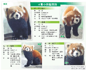 成都大熊貓繁育研究基地向海洋公園借出的4只小熊貓,名字分別叫泰山、聰聰、柔柔和栗子,兩雄兩雌,現(xiàn)時仍未滿1歲,平均只有8至9個月大,屬基地繁殖的第二代小熊貓,各有不同性格及特征。