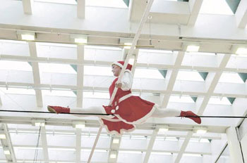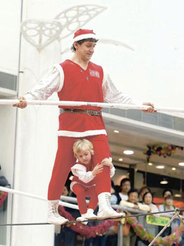 據(jù)香港明報報道,一行8人的衛(wèi)氏家族成員,昨(6日)于香港大埔商場作高空表演。在半小時表演內(nèi),衛(wèi)氏家族成員粉墨登場,一家大小扮成圣誕老人。帶領(lǐng)家族成員的Peter Mario,先以一個“筋斗”給觀眾一個見面禮,再來一招“倒豎”,這些動作看似簡單,但卻是在高空13米、離地近兩層樓高的鋼在線進(jìn)行。