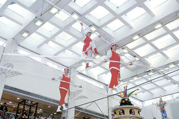 25歲的Jasmine是Peter的女兒,昨天她表演在鋼在線推手推車,走過10多米的距離。樣貌標致的Jasmine,一面手執平衡桿,面帶笑容走過腳下的幼絲,臺下的觀眾卻為她“一步一驚心”。Jasmine說,她曾試過離開表演事業,在外另覓工作,但始終心系腳下這條鋼線!笆冀K一家人 能一起工作,獲得安全感和快樂,是外面找不到的,而且我熱愛演出!(周淑蘭)