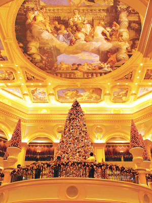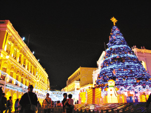 澳門的議事廳前地那一棵足有兩三層樓高的許愿樹燈飾會讓你眼前一亮,一層層藍盈盈小燈密密圍著,絲毫不會露出光裸電線,底下是制作頗為精細的大雪人,禮物堆,可愛得幾乎每個經(jīng)過的路人都忍不住要掏出手機去拍一張,小孩子更不用說了,嚷嚷要媽媽放開手好讓他爬上去拆禮物,看得人忍不住要會心微笑。然后郵政局門口那一棵許愿樹也十分華麗,而且是很別出心裁地“長”在了大門口,叫進出的人都覺得自己是在天使庇佑之下似的,忍不住要在心里許個小小愿望。即使是在普通的非鬧市區(qū),馬路上也掛上了串串燈飾,顯得氣氛特別濃。至于各大娛樂場所里面的許愿樹,更是一棵賽一棵的漂亮,一層樓高的是小意思,兩層樓高的是普通規(guī)模,最夸張的是威尼斯人度假村,幾乎每隔一段距離就有一棵或大或小的許愿樹,上面還很細心地掛滿了蝴蝶結(jié)、許愿球、小禮物、小襪子……看得人又忍不住要掏手機來玩自拍,不過即使一棵一張,估計即使是512M的卡都會不夠用呢。