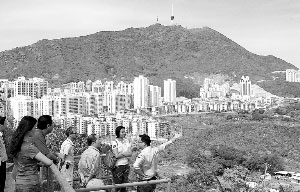 陳崇輝帶記者到打鼓嶺白虎山頭察看蓮塘-香園圍口岸選址,左側建筑為深圳蓮塘,右側為香港香園圍,遠處為深圳梧桐山。(圖片來源:深圳特區報)