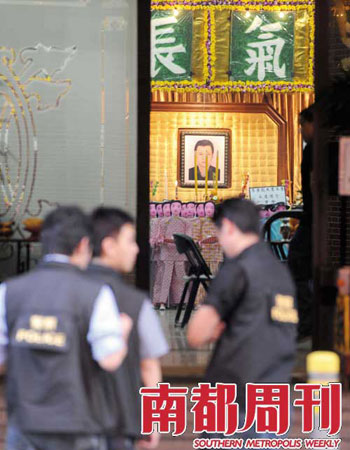 在靈堂掛著的另一副更正式的挽聯是:“劍膽無畏,永不妥協!膘`堂祭奠的死者,新義安近年最“出位”的黑道頭目,拼殺20余年的李泰龍,最終在8月4日凌晨,在自己的地盤尖沙咀,被仇家有計劃地斬殺。短短30秒的車撞、刀砍,曾經傷人無數的他,最終血噴街頭而終,震撼香港。