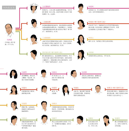 作為澳門首富,“賭王”何鴻燊及其家族控制著高達5000億港元的資產;同時,作為富人明星,何鴻燊不但被港澳坊間稱為“何大口”(對媒體說話百無禁忌),其四位太太所生的17個子女,更一直是各大報紙雜志商業、時政和娛樂版多年來的風頭人物。