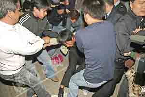 至晩上近八時,涉案警員在同僚護送下步上警車,場內旅客見狀一涌而上,要求相關者留下,雙方發生推撞。期間,多名警員強行將董姓及男領隊等人帶走,旅客見狀阻止。