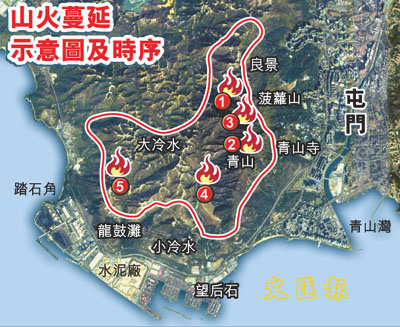 有關(guān)部門發(fā)言人形容,這次山火所到之處都變成焦土,幸虧消防處救火策略成功,設(shè)定7個重點保護區(qū)救火,包括青山禪寺、山頂?shù)陌l(fā)射站、高壓電纜站和散石灣新村山坡等區(qū)域。